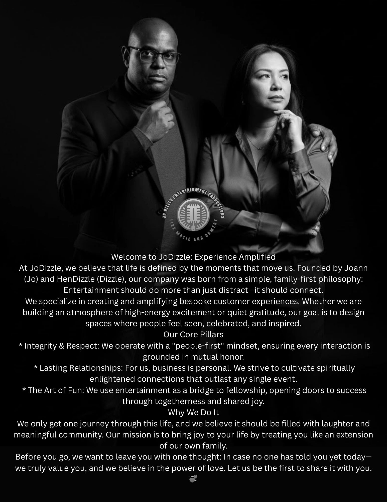 At Jo Dizzle Productions, we are committed to providing an exceptional entertainment experience. Our goal is to enhance every concert with unmatched hospitality and joy, setting the stage for an unforgettable event.